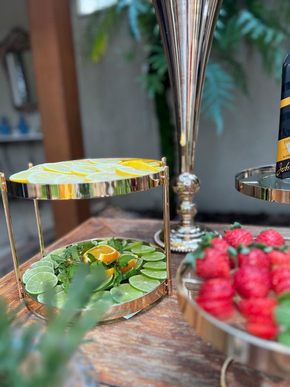 Bandeja dupla de metal cromado na cor dourado com bases em vidro transparente.