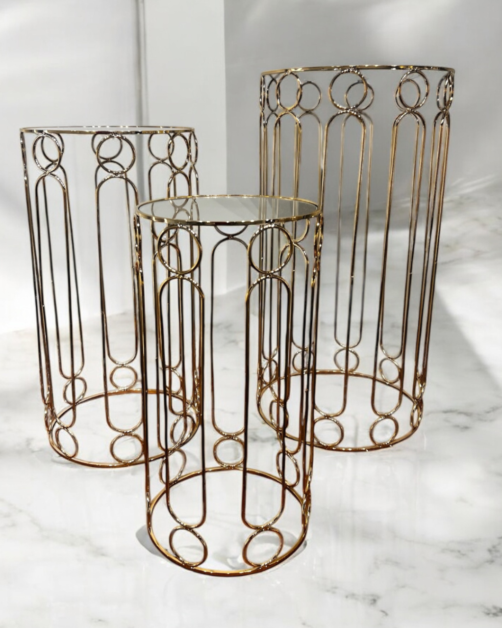 TRIO DE MESAS EM METAL NA COR DOURADO BRILHANTE COM TAMPO ESPELHANDO.