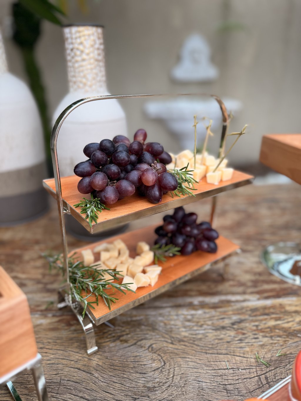 Suporte duplo em metal com banho cromado e tampo de madeira